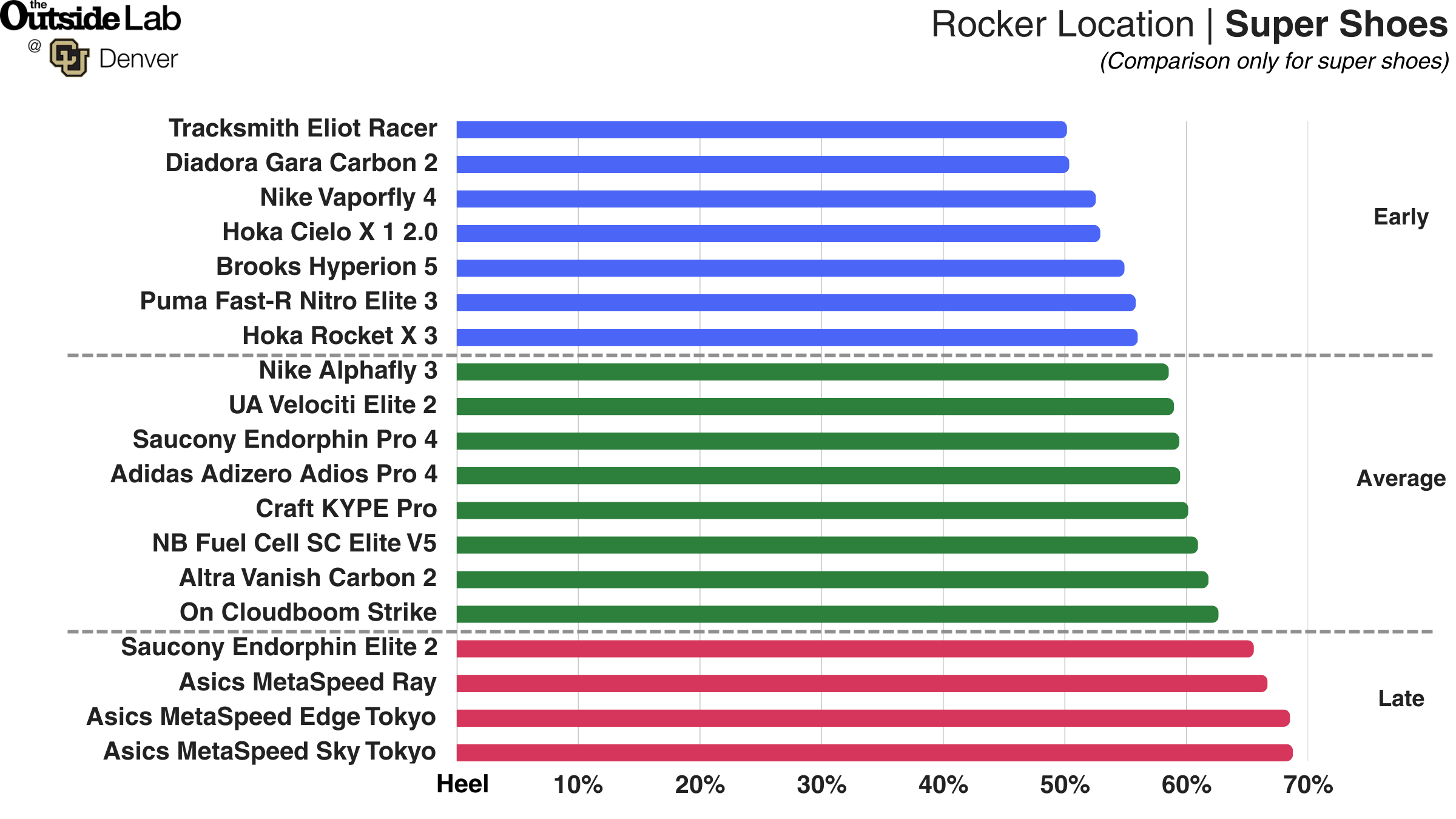 The recorded rocker measurement location is calculated as a percentage of the total length from the heel (heel is 0%, toe is 100%) and evaluated for the stage of the stride. When considering all running shoes, “early” rocker is typically considered 60% and before, while “late” stage is greater than 70% (near 75%). All tested super shoes, however, fell into the “average” or “early” stages for standard run footwear, so we created a scale specifically for plated super shoes based on the average of our measurements.